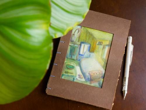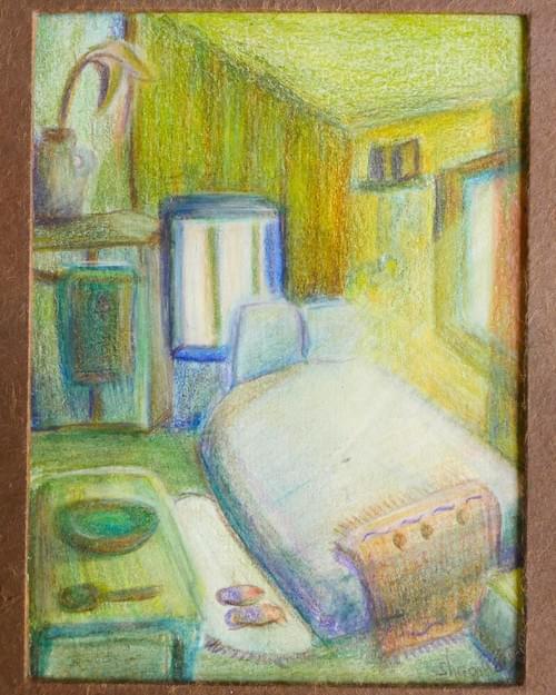 ——這個畫就是這麼來的。一天在桃園的窗戶看出去,看到陽光灑進來;突然就跳到某個時空的自己,在瑞士的小木屋房間裡,看著光。