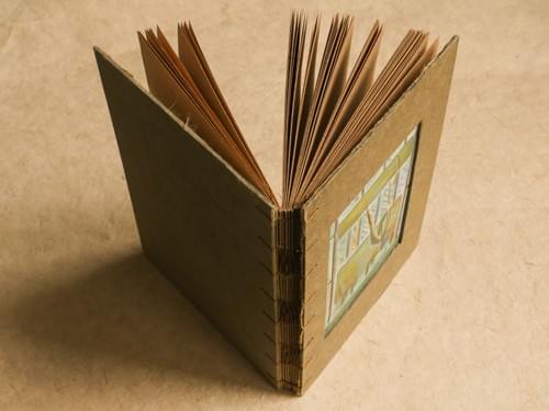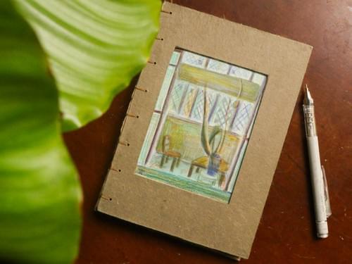 A5 (148mm × 210mm) / 80 lb kraft-colored inner pages (approx. 120gsm) / Handmade green cotton paper cover / Hand-pulped endpapers / Original hand-painted cover / Hand-stitched with brown waxed thread