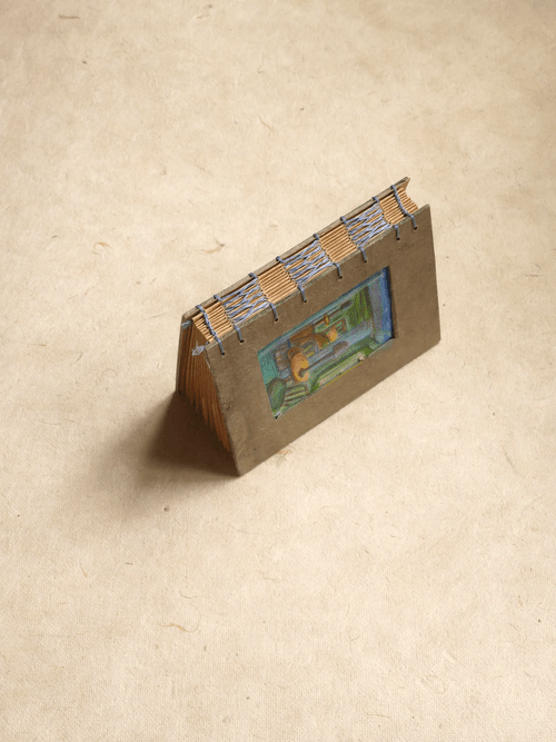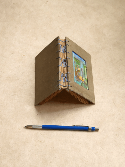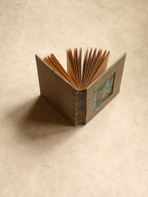 95 × 128mm / Kraft-colored 80lb inner pages / Handmade gray-green cotton paper cover / Fully hand-painted cover / Hand-stitched with blue-violet waxed thread