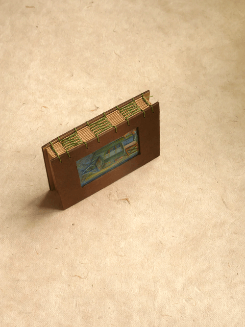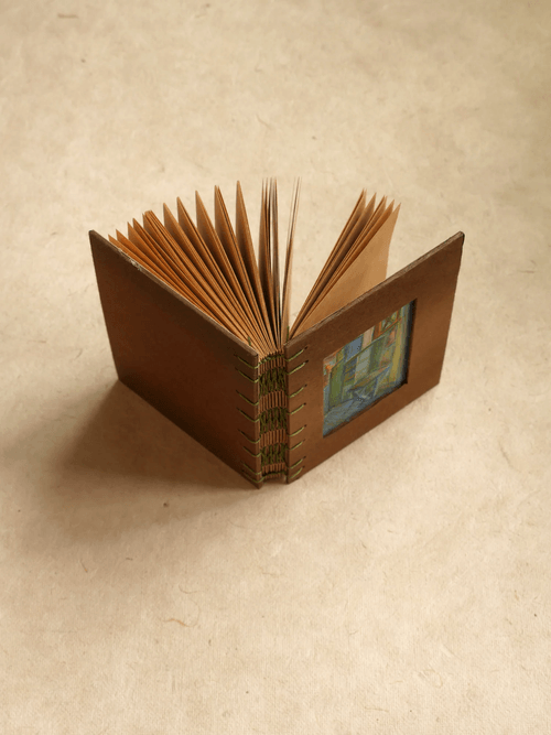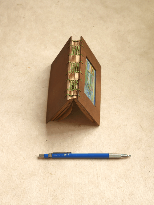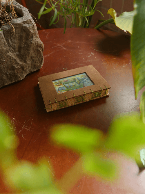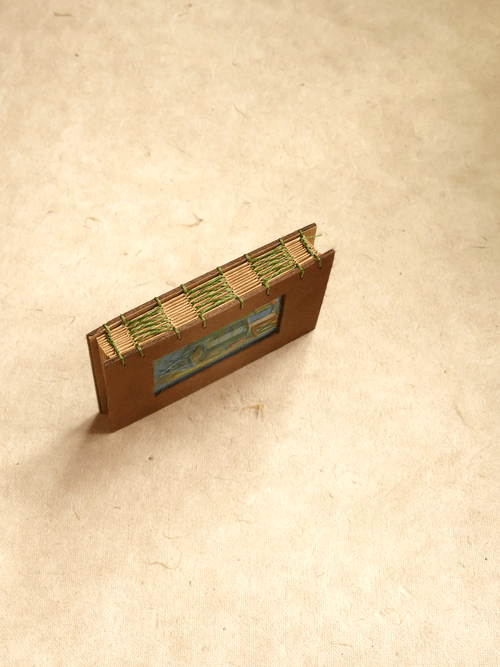 95 × 128mm / Kraft-colored 80lb inner pages / Handmade brown cotton paper cover / Fully hand-painted cover / Hand-stitched with matcha green waxed thread