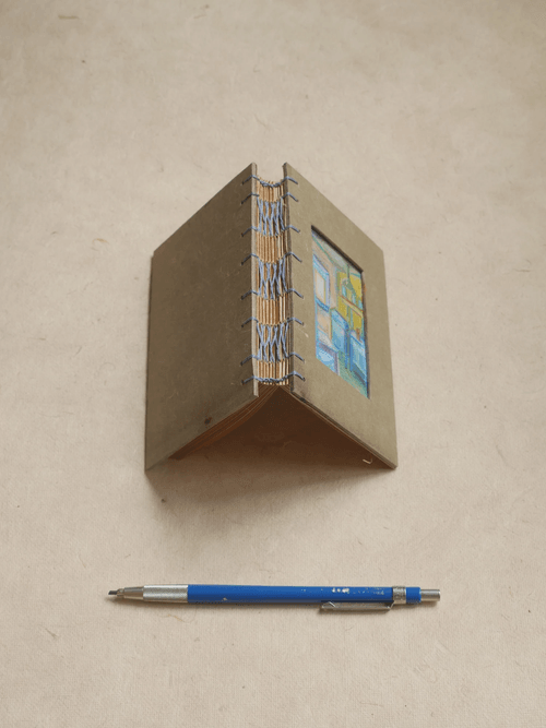 95 × 128mm / Kraft-colored 80lb inner pages / Handmade gray-green cotton paper cover / Fully hand-painted cover / Hand-stitched with blue-violet waxed thread